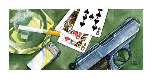 To continue theme of the contemporary nature of Official Secrets, I followed clues from The Times Obit, added objects that Bond might have collected, as well as those mentioned in numerous novels - most of which need little explanation, ubiquitous as they are. Hence the Haig & Haig, Ben Hogan golf clubs, the Calamity Jane putter, Leica M3 camera, and the Lugar pistol, to mention a few. Some exceptions do occur. Blofeld’s samurai sword, for example, has the SPECTRE mon at the top of the handle. Unspecified “protection” was mentioned in The Spy Who Loved Me, so it was either Forex or Trojan condoms…